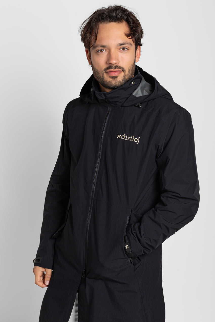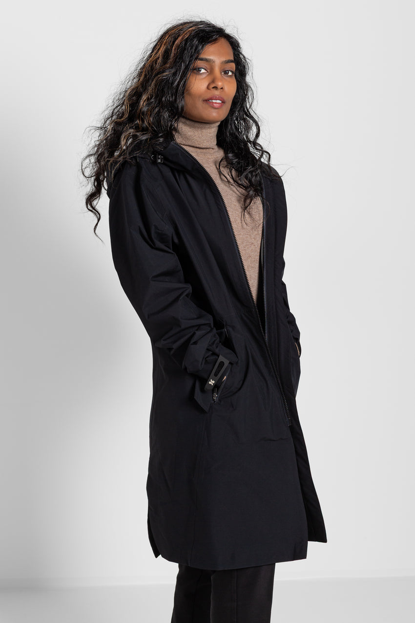Der Mantel macht keinen Hehl aus seiner Herkunft: Spezifische Features sorgen dafür, dass sich technische Performance und Alltagstauglichkeit nahtlos verbinden. Um maximale Bewegungsfreiheit zu gewährleisten, verfügen sowohl der Mantel als auch die Innenjacke über Zwei-Wege-Reißverschlüsse. Der gerade Schnitt mit vorgeformten Ärmeln sorgt für hohen Tragekomfort, ohne die Silhouette einzuengen.